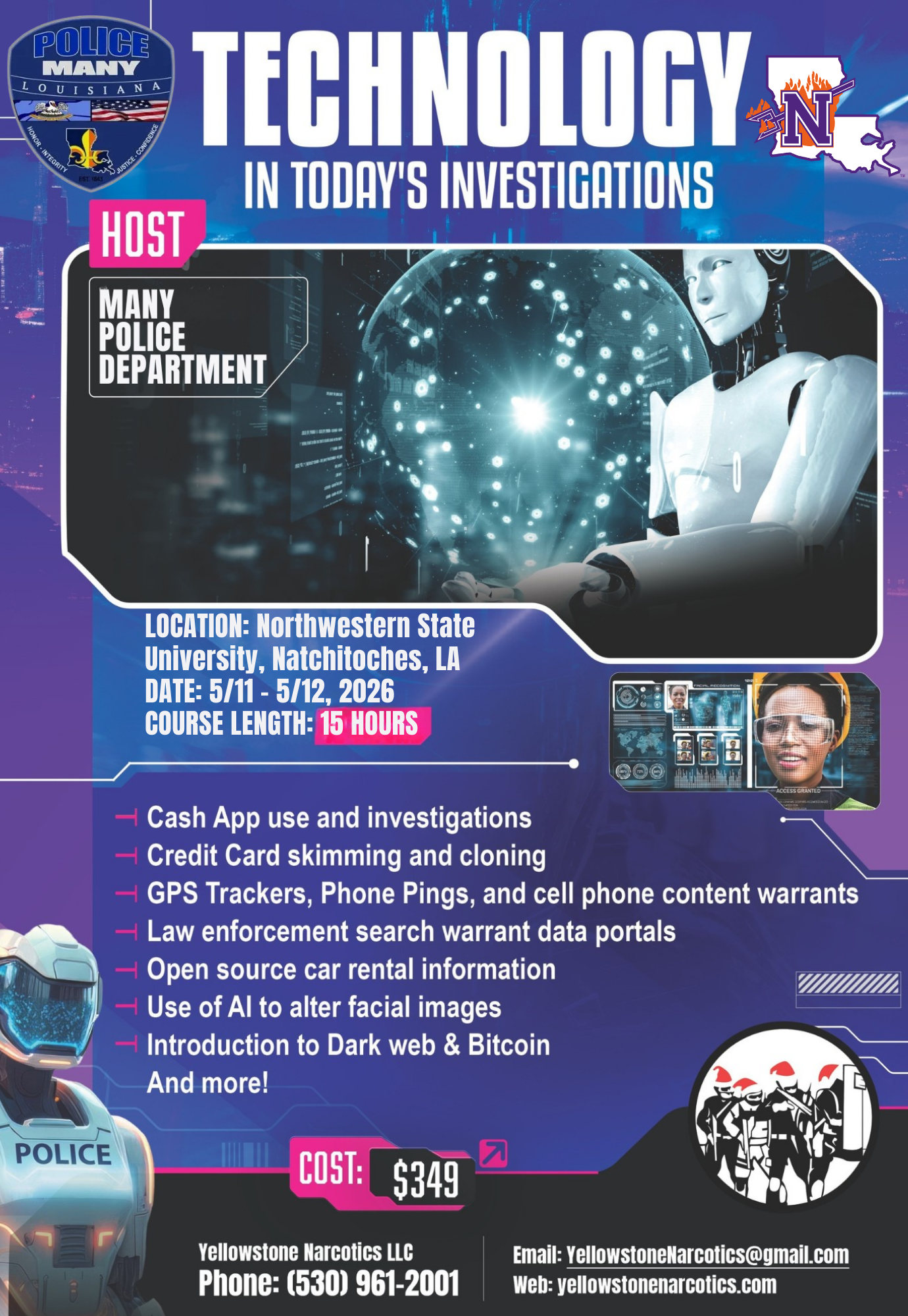 From Snapchat to Cash App, and everything in between, this course ensures our law enforcement is up to date with today’s trends and technologies. This course teaches an overview of how to submit search warrants to various private companies, provides a basic understanding of crypto currencies and the dark web, and introduces students to various law enforcement resources and technologies available. Attendees will learn the difference between WhatsApp and Signal, how phone pings work and assist in law enforcement investigations and even obtain knowledge of credit card fraud schemes and methods of investigation. Students will also be provided with tools to assist them in investigations long after leaving this course to include ways of identifying suspects associated with unknown phone numbers and law enforcement portals that will aid in writing search warrants for social media entities. Yellowstone Narcotics will also teach students what information can be obtained from cell phone companies, how they differ, and the proper verbiage needed in search warrants to obtain the requested information. This course is a must have for any investigator or patrol officer looking to take their skills to the next level.